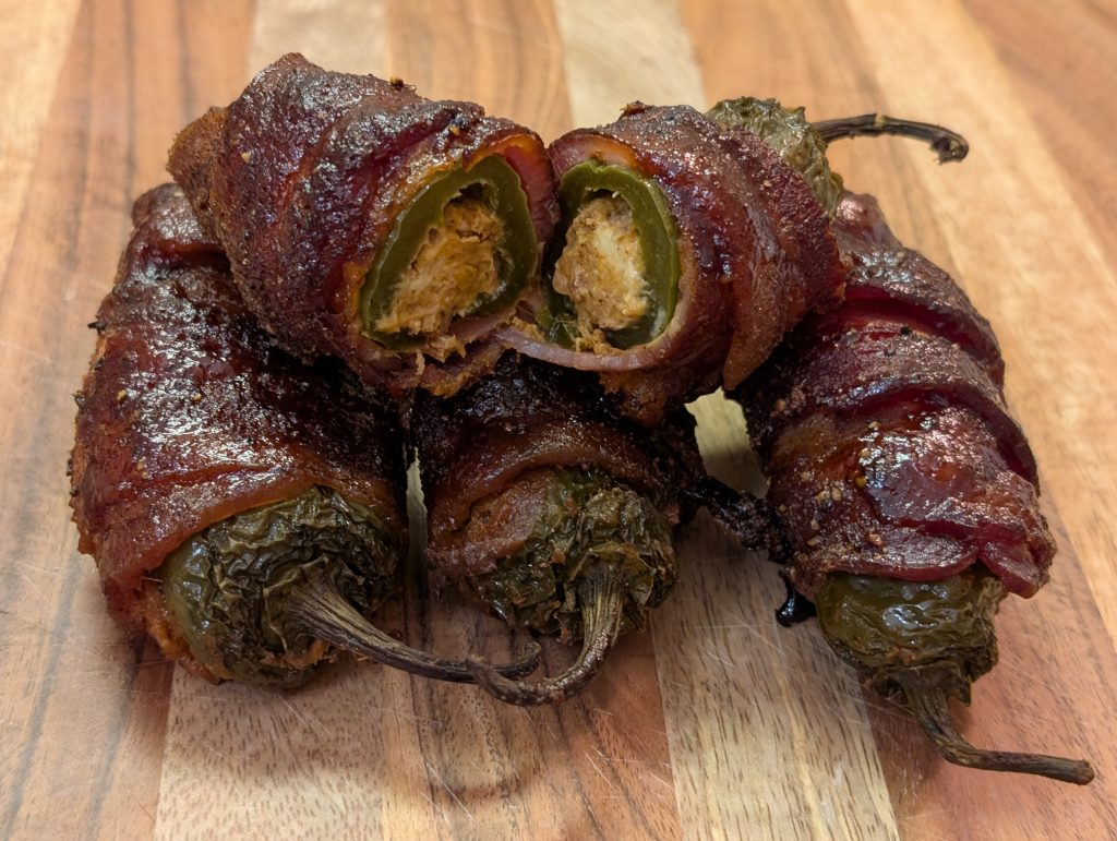 SEASONAL- Jalepeno stuffed with pulled pork, cheeses, sauce and spices then wrapped in bacon and smoked.